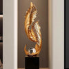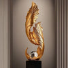 Realizzata in resina , abbinata a elementi in vetro e legno , questa statua fonde estetica e qualità artigianale. Il contrasto tra l'oro scintillante della piuma e la base sobria crea un armonioso equilibrio visivo, perfetto per interni moderni e raffinati.